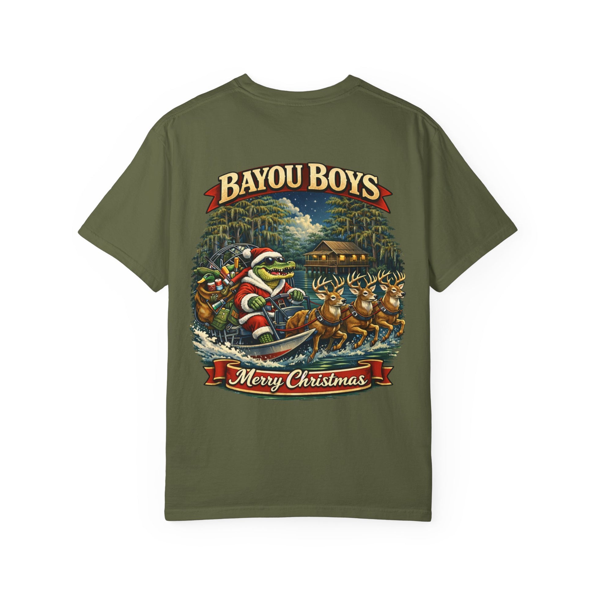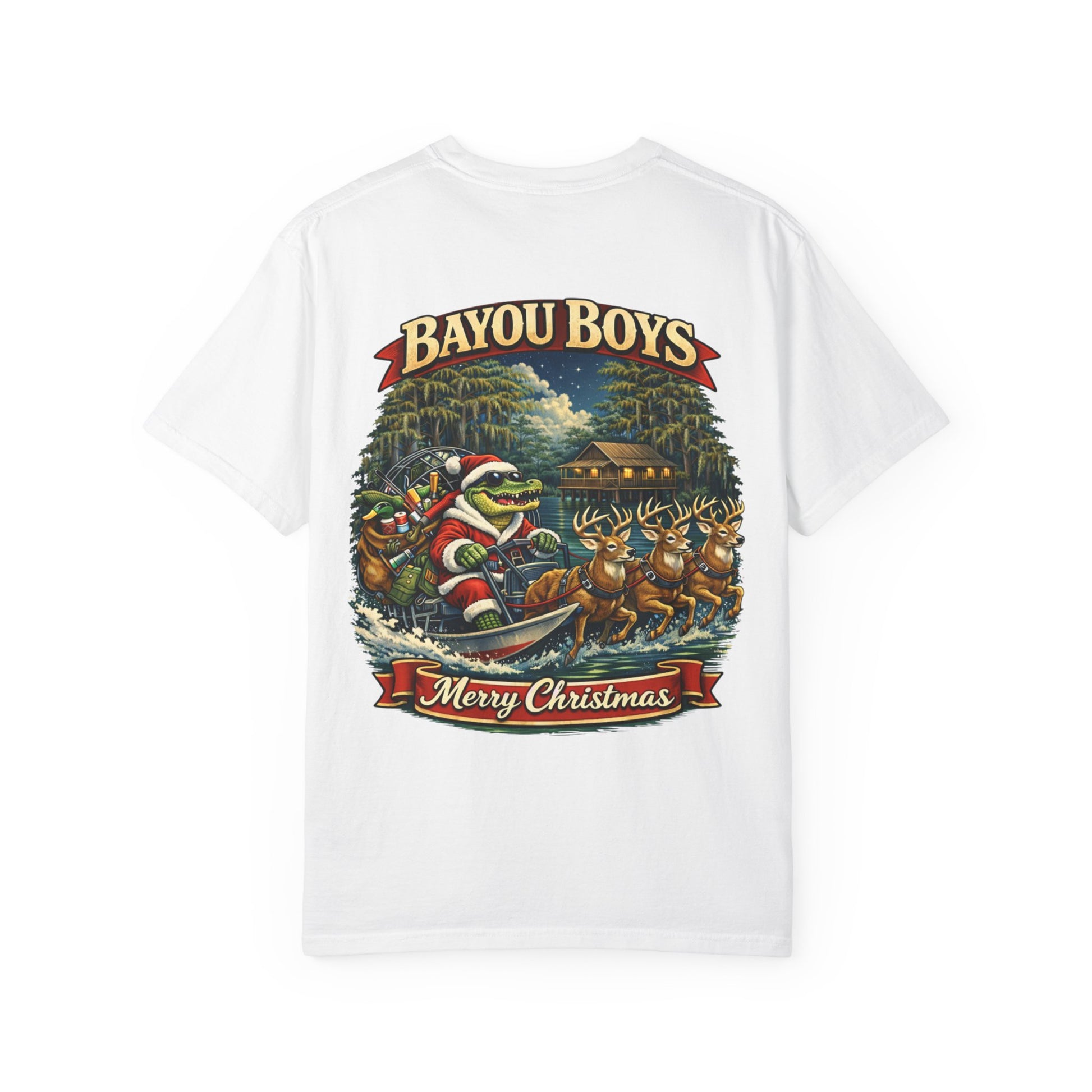 This heavyweight, garment-dyed tee brings a warm, lived-in feel to holiday weekends on the water. The relaxed fit and soft, post-dye texture drape comfortably over layers after a morning cast or an evening bonfire. A small chest emblem and a bold, vintage-style back scene — Santa navigating a bayou in a crawfish boat pulled by deer — make the shirt feel like a local legend you can wear. It’s the kind of shirt you reach for when you want something sturdy, familiar, and a little nostalgic for slow, mossy evenings and loud, laughing get-togethers. Overall, this is a Louisiana Christmas.