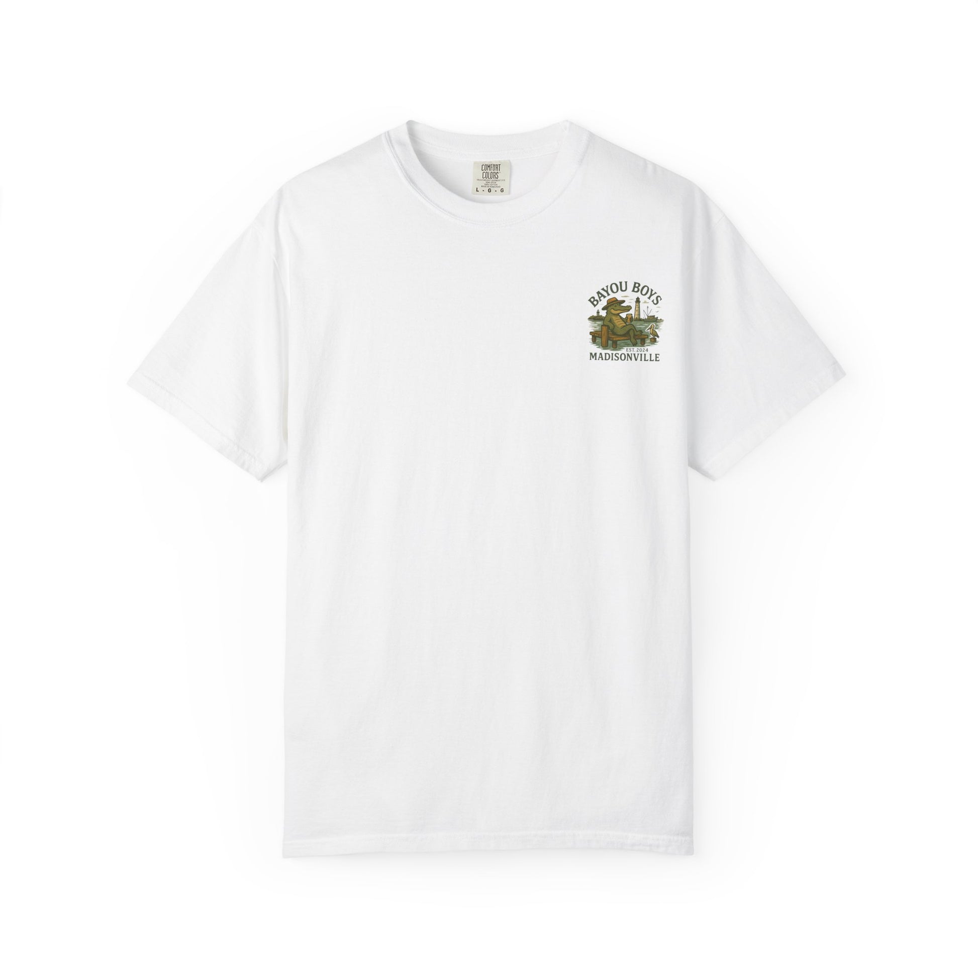 This shirt is part of the Bayou Boys Hometown collection and is designed to capture all of the culture and tradition of Madisonville, Louisiana. Larger details, such as the lighthouse, share an iconic part of Madisonville, while smaller details, like the wooden boat the gator is in, are a nod to the culture and a popular event, the wooden boat festival.
